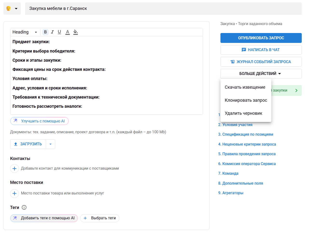 Такой набор функций помогает команде работать с процедурой в одном контуре и быстрее переходить от публикации закупки к выбору поставщика.