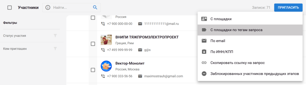 ИИ-алгоритм площадки сам подбирает кандидатов по нужным параметрам и высылает им приглашения на участие в закупке