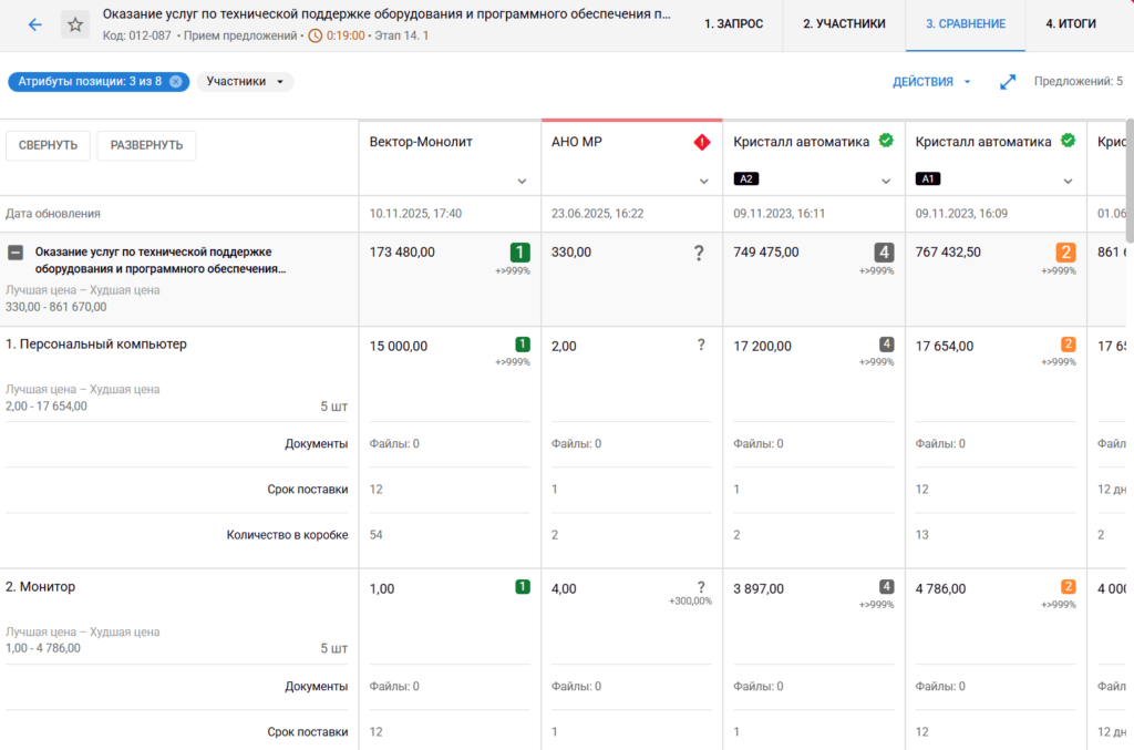 Система автоматически формирует сравнительную таблицу со всеми предложениями, где отображает не только цену, но и другие важные критерии — например, сроки работы. Это удобно: закупщик видит все предложения и в одном месте может их проанализировать, чтобы выбрать лучшее.