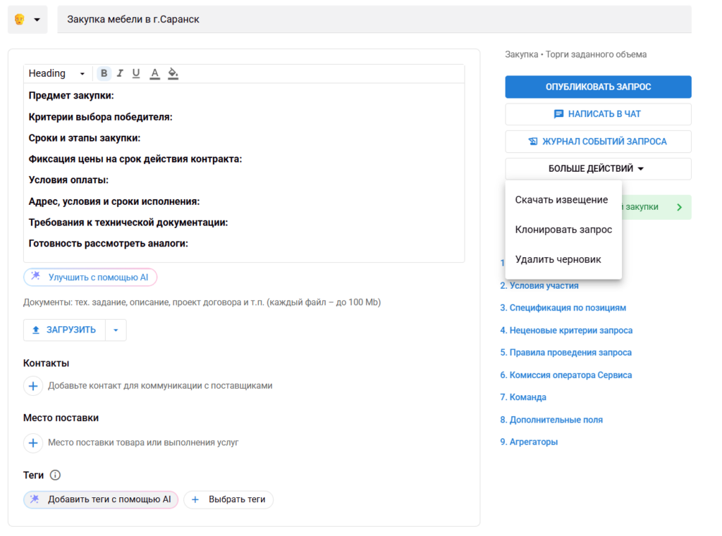 Часто повторяющиеся закупки можно размещать буквально за пару минут — помогают функции клонирования и создания шаблонов. Не нужно каждый раз писать ТЗ и грузить документацию с нуля