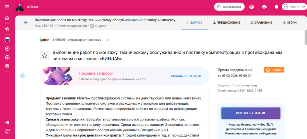 В нашей закупочной практике Bidzaar выполняет ключевую роль как многофункциональный инструмент. Помимо базовой функции проведения тендеров, платформа: